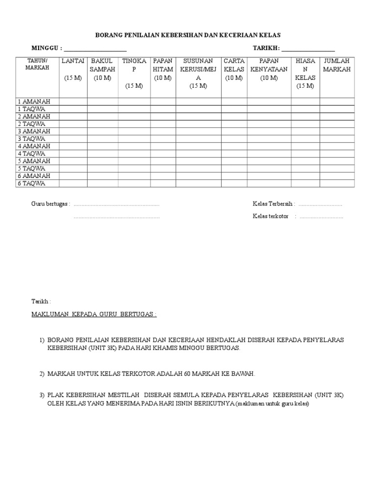 Doc Borang Penilaian Kebersihan Dan Keceriaan Kelas 2015 Dan Guru Bertugas Fis Ibrahim Academia Edu