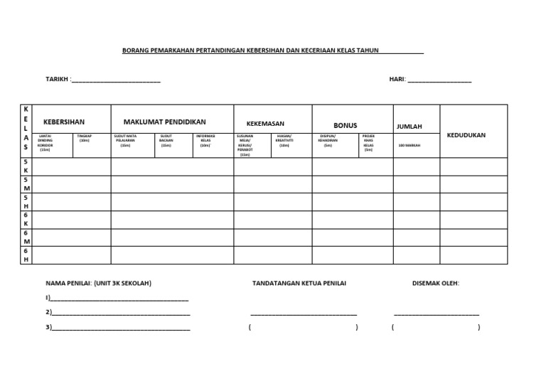 Borang Pemarkahan Pertandingan Kebersihan Dan Keceriaan Kelas Tahun Pdf